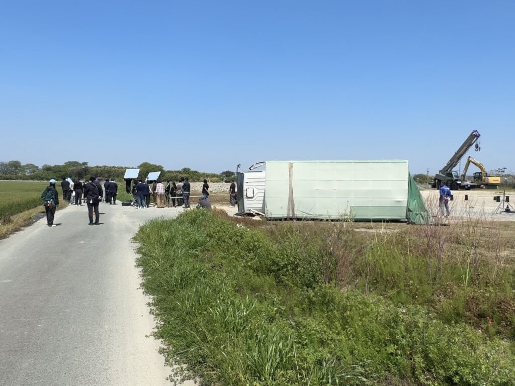 車の横転などもあり、重機なども必要な撮影でしたが、